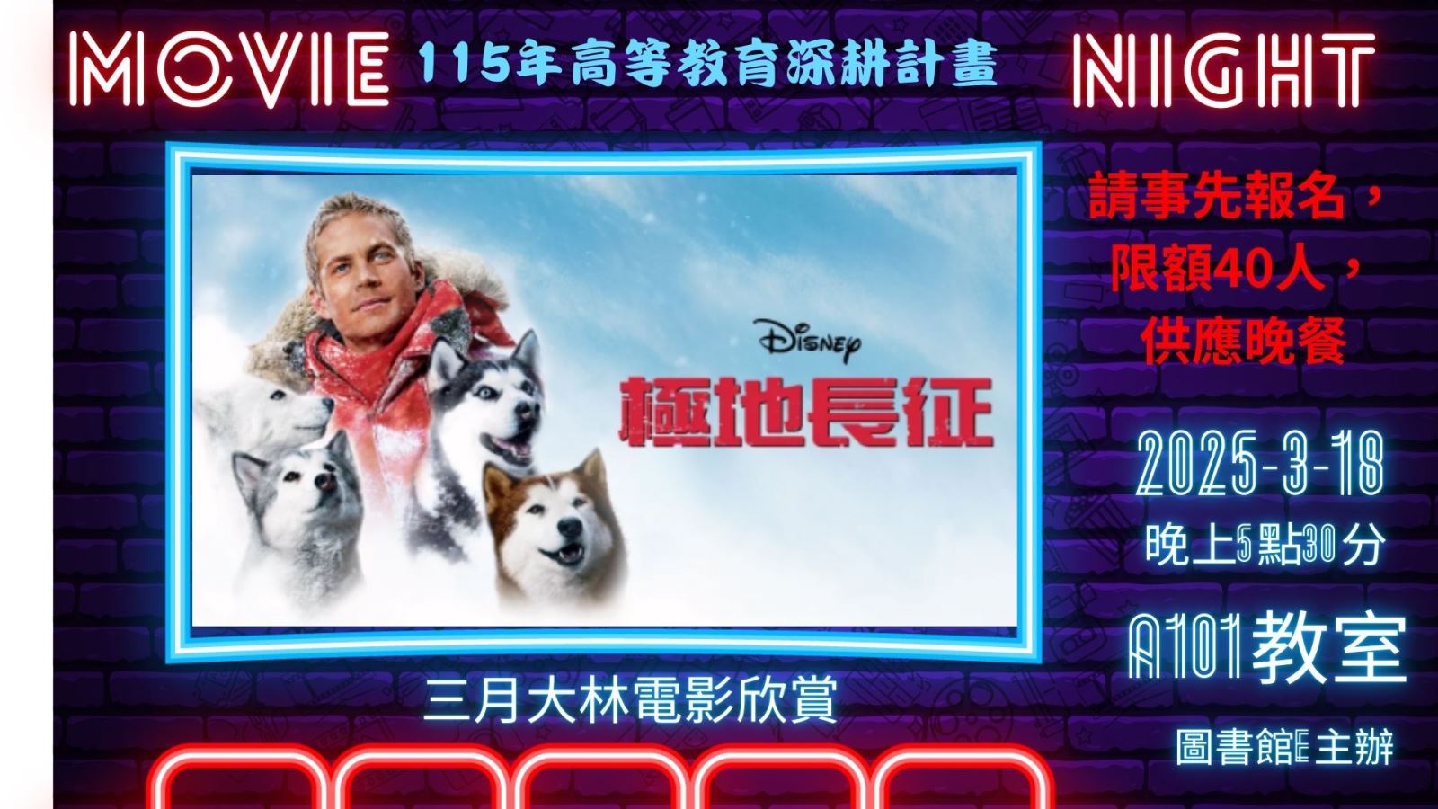 日期/時間:115.3.18(三) 提供晚餐,請事先報名 限額40名 地點:大林校區A101教室 主辦:圖書館 播放影片:《極地長征》 導演:法蘭克·馬歇爾 演員:保羅·沃克、布魯斯·葛林伍、傑森·畢格斯主演 簡介:故事講述謝利心愛的八隻雪橇犬在世紀暴風雪下被困南極,牠們必須奮力頑抗,掙扎求存,等待主人把牠們救出的一天。在成功之前,謝利絕不放棄!人狗之間的友情和信任令人動容,謝利和雪橇犬憑著勇氣和毅力,最終成功團聚!《極地長征》是部勵志的動作歷險電影,讚揚八隻雪橇犬與主人謝利(保羅沃克飾)的深厚友情。 報名網址:https://forms.gle/aJT3QyfD1Xp7MPSJ9