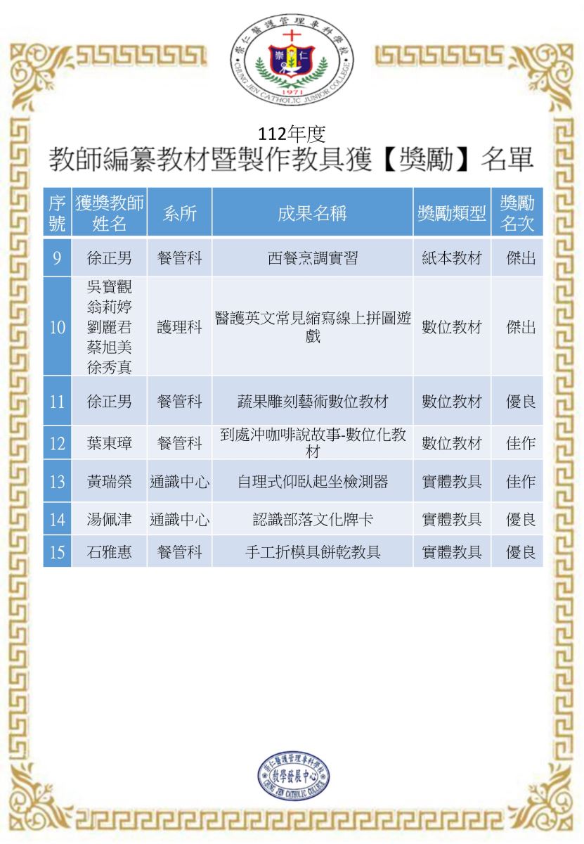 112年度教師編纂教材暨製作教具獲【獎勵】名單(二)