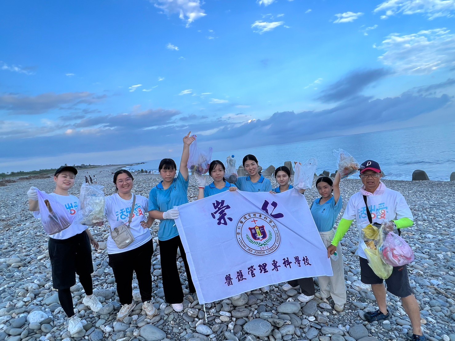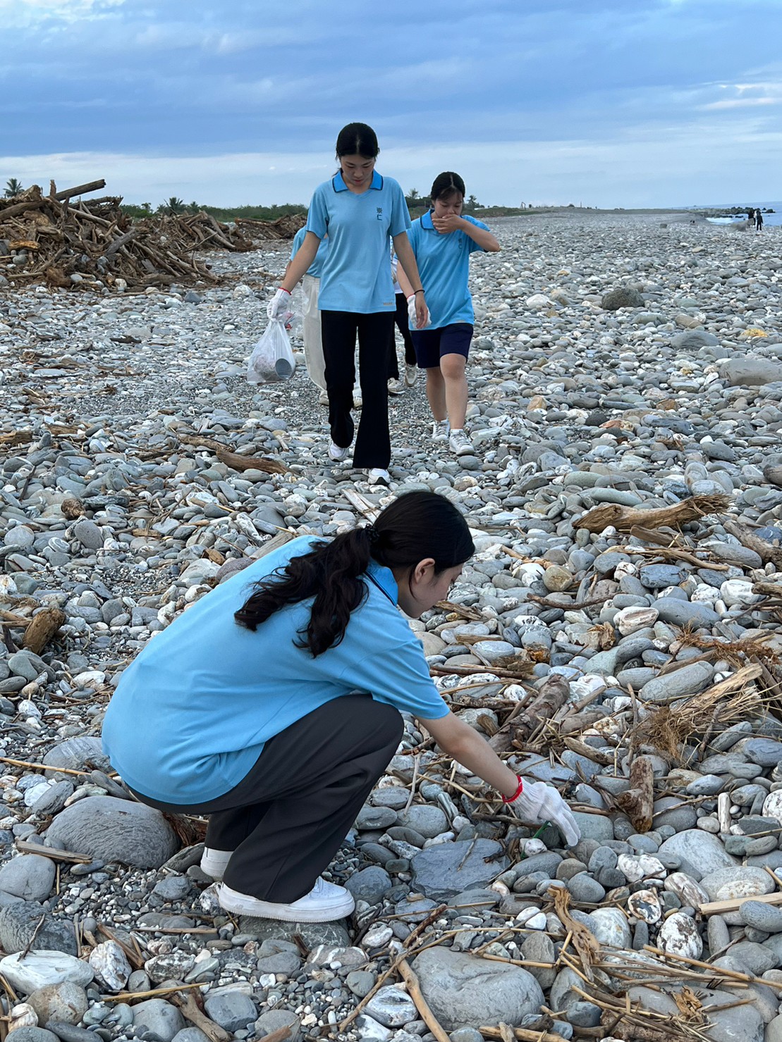 服務的最後,來到台東海濱公園,一則欣賞大自然最真的美景,也就是無邊際的大海。同時,也藉此將聯合國永續發展目標其中之一:「保育海洋與海洋資源」,告訴青年學子們,並邀請她們一起以行動愛海洋,我們以準備的手套、垃圾袋,來撿拾沙灘上的垃圾,不一會兒,裝滿了手上的垃圾袋,青年學子們在行動中,理解與體會到保育海洋的重要性。
