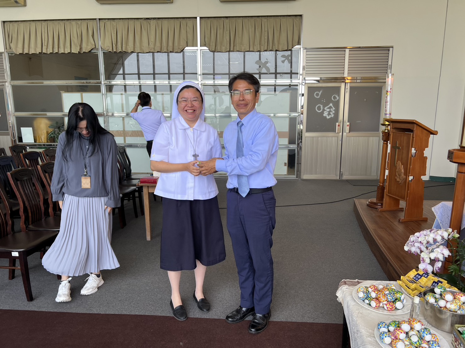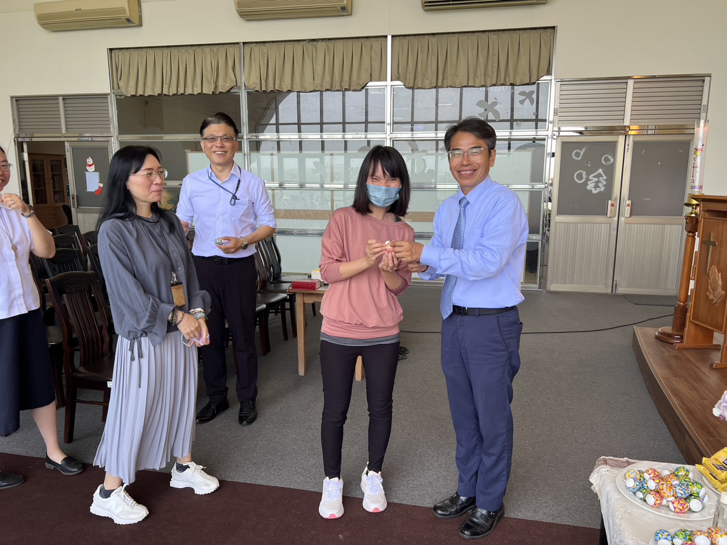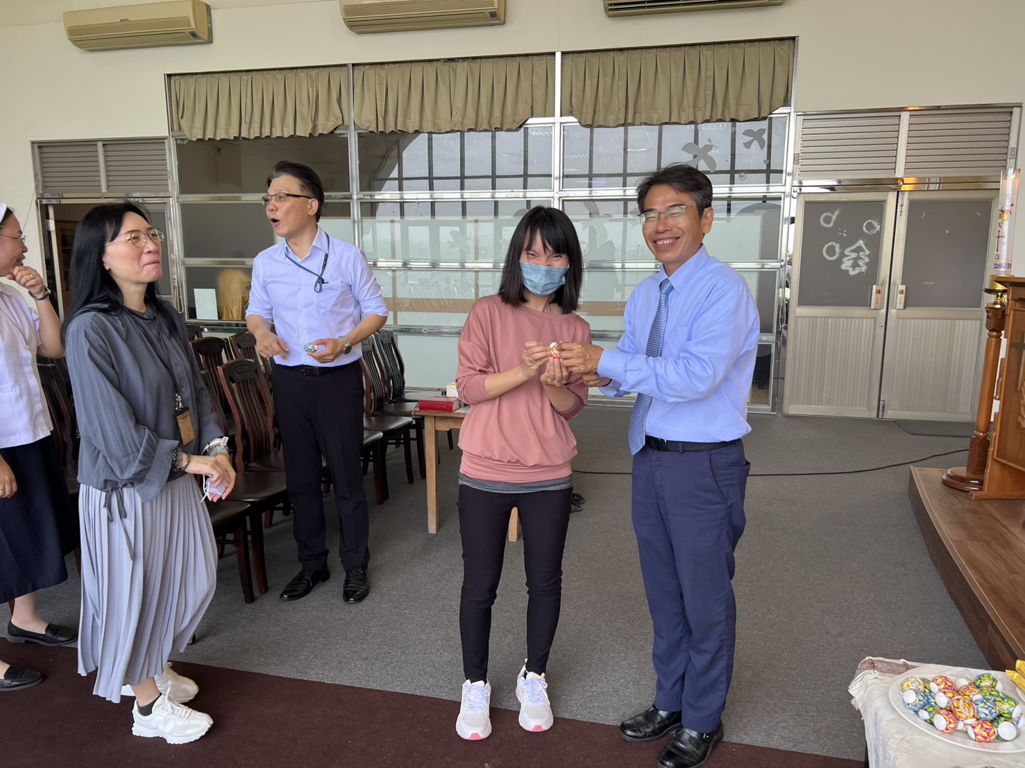 今天的校園彌撒,校長也來到我們當中,與我們一起感恩與祈禱。彌撒後,校長也分送復活蛋給參與彌撒的同仁,並且還帶到二樓,分享給會計室、秘書室等行政與教學同仁們復活的喜樂。