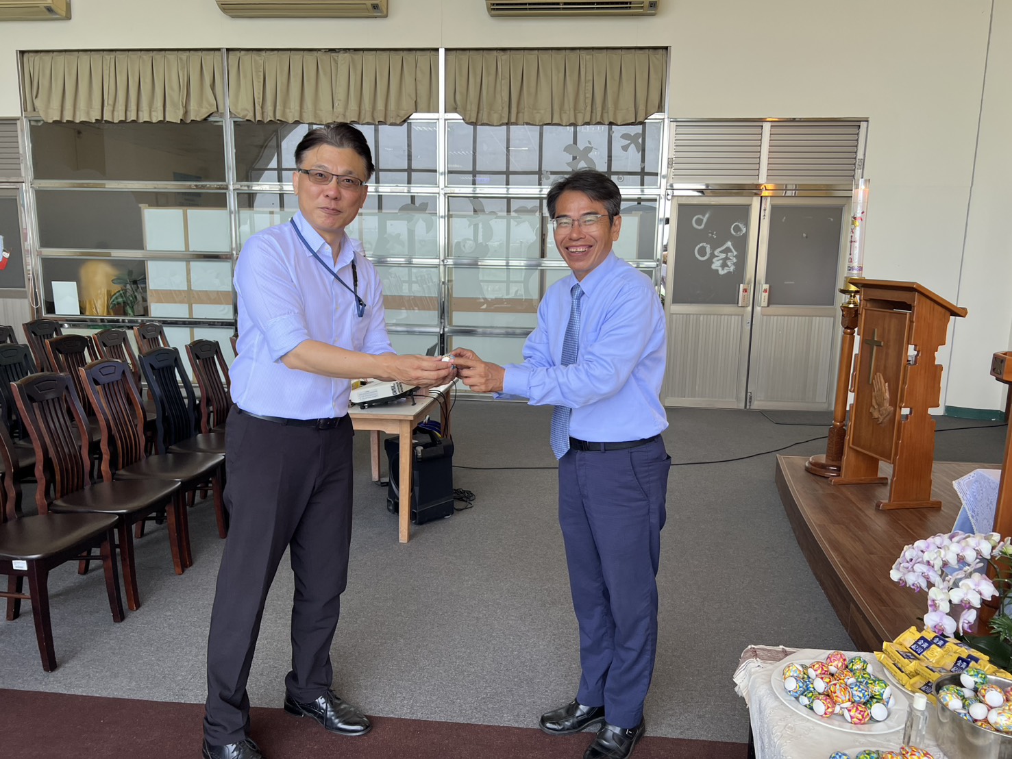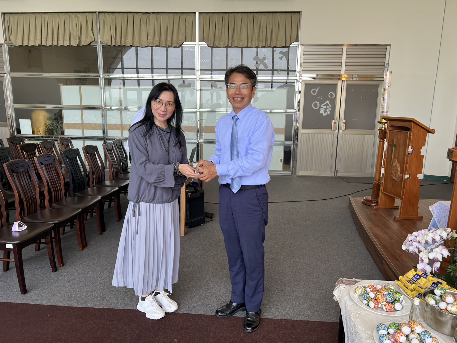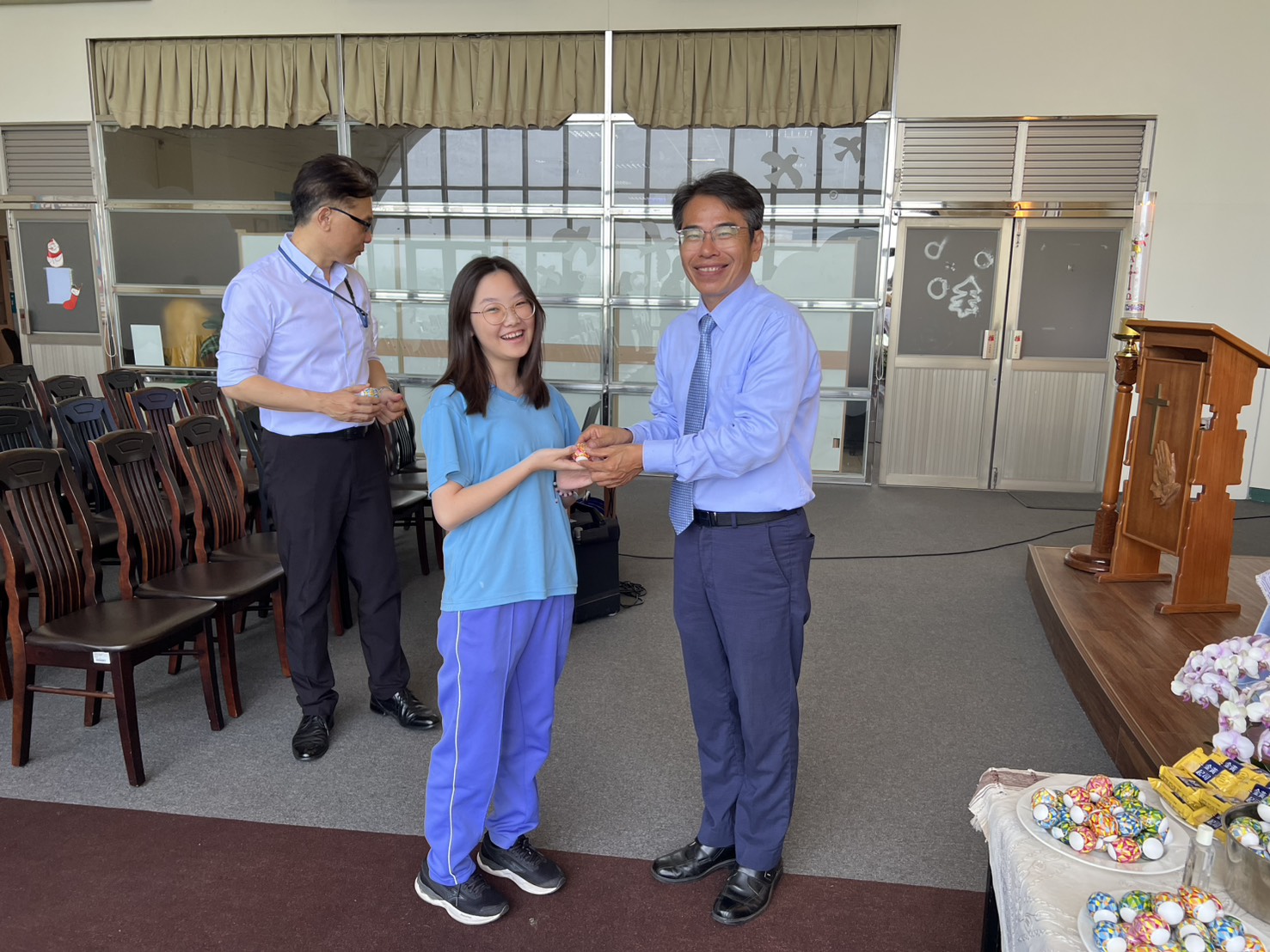 今天的校園彌撒,校長也來到我們當中,與我們一起感恩與祈禱。彌撒後,校長也分送復活蛋給參與彌撒的同仁,並且還帶到二樓,分享給會計室、秘書室等行政與教學同仁們復活的喜樂。