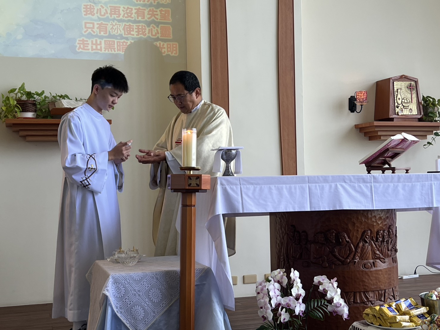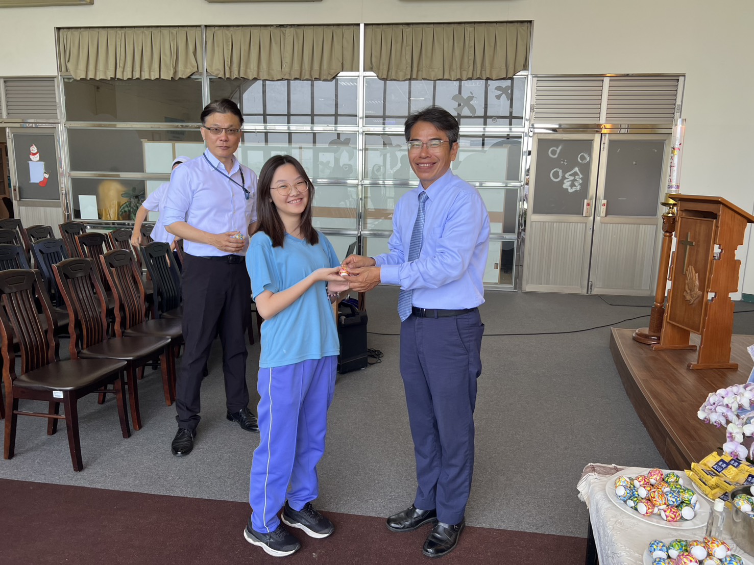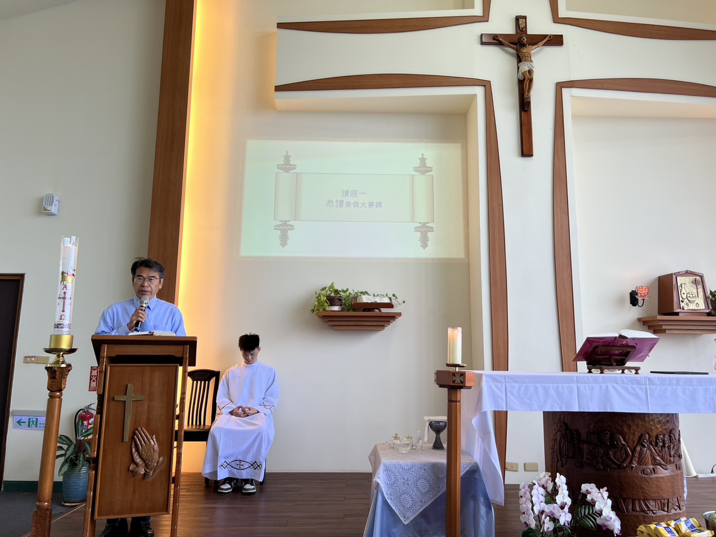 今天的校園彌撒,校長也來到我們當中,與我們一起感恩與祈禱。彌撒後,校長也分送復活蛋給參與彌撒的同仁,並且還帶到二樓,分享給會計室、秘書室等行政與教學同仁們復活的喜樂。