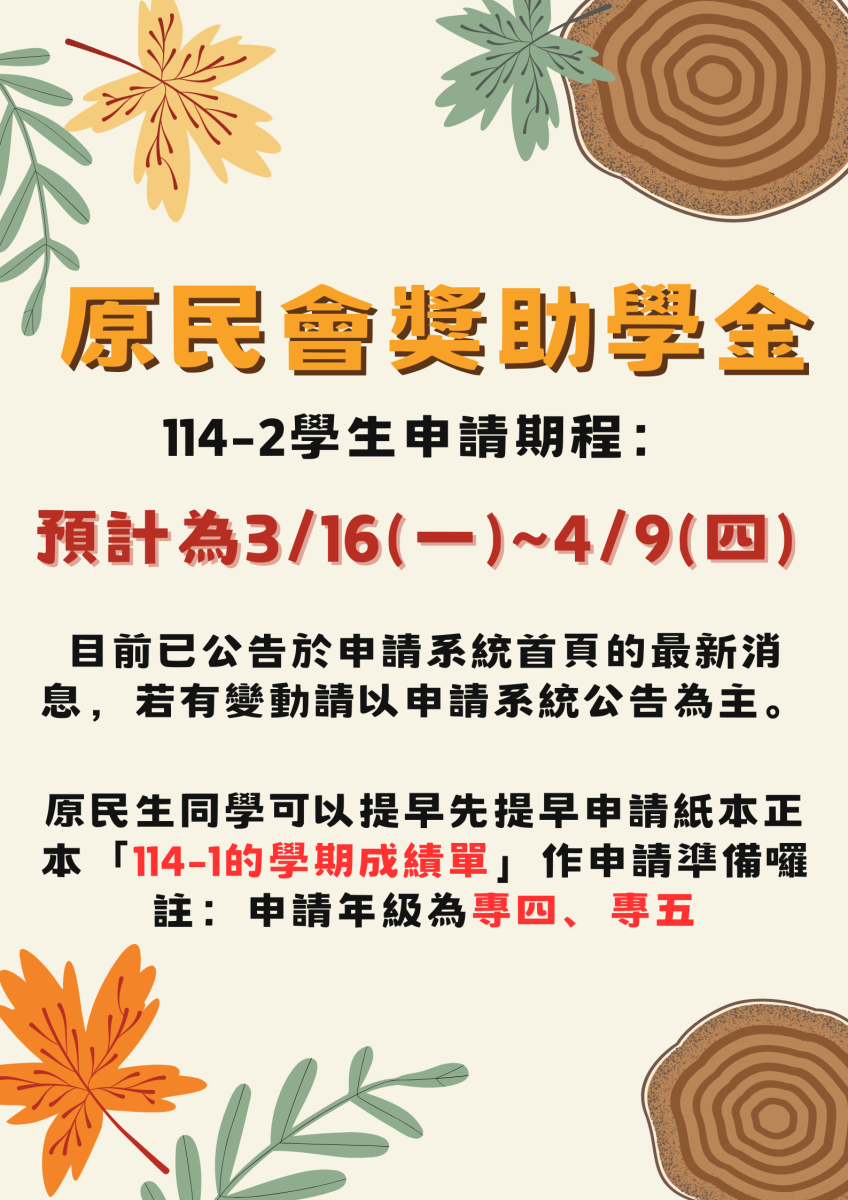 一、114-2學期,學生線上填寫申請資料期程,預計為「115.3.16 的 00:00 起 至 115.4.9 的 23:59 止」,115.3.16 00:00 才會開放本申請系統線上填寫申請資料。 二、申請身份:專四、專四年級原住民學生。 三、申請系統連結