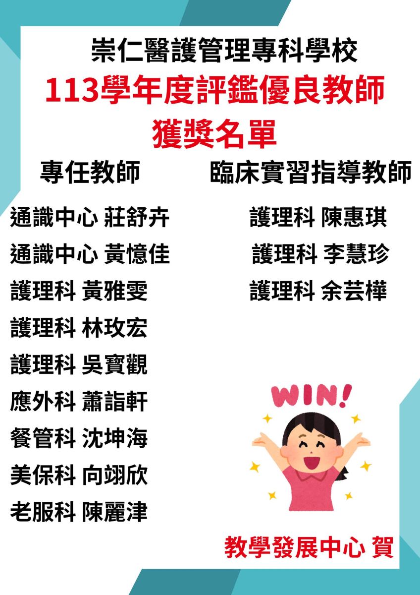 113學年度評鑑優良教師 獲獎名單
