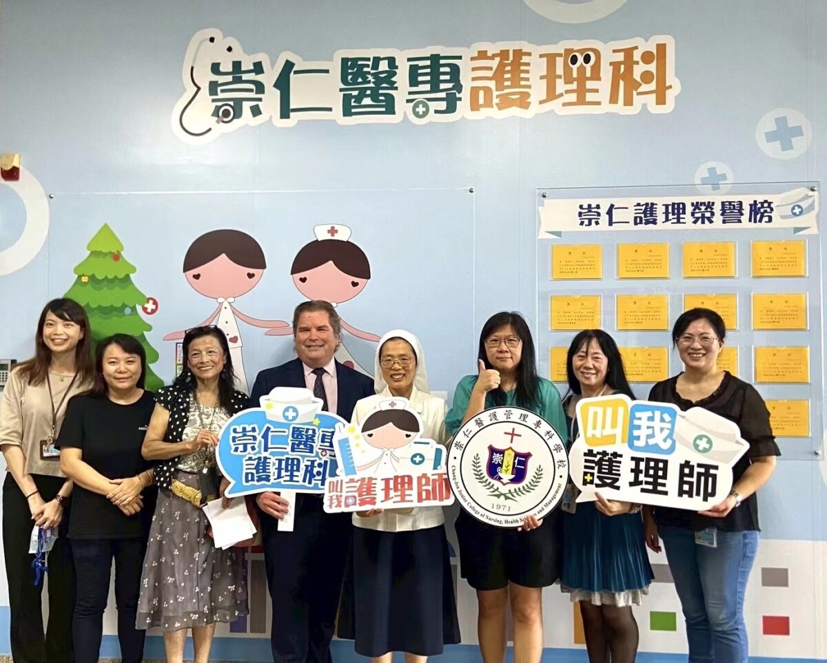 ▲CEO Richard de Haast 與崇仁醫專護理科師長合影留念,並手持「叫我護理師」及「崇仁醫專護理科」標語,象徵培育專業護理人才的使命。