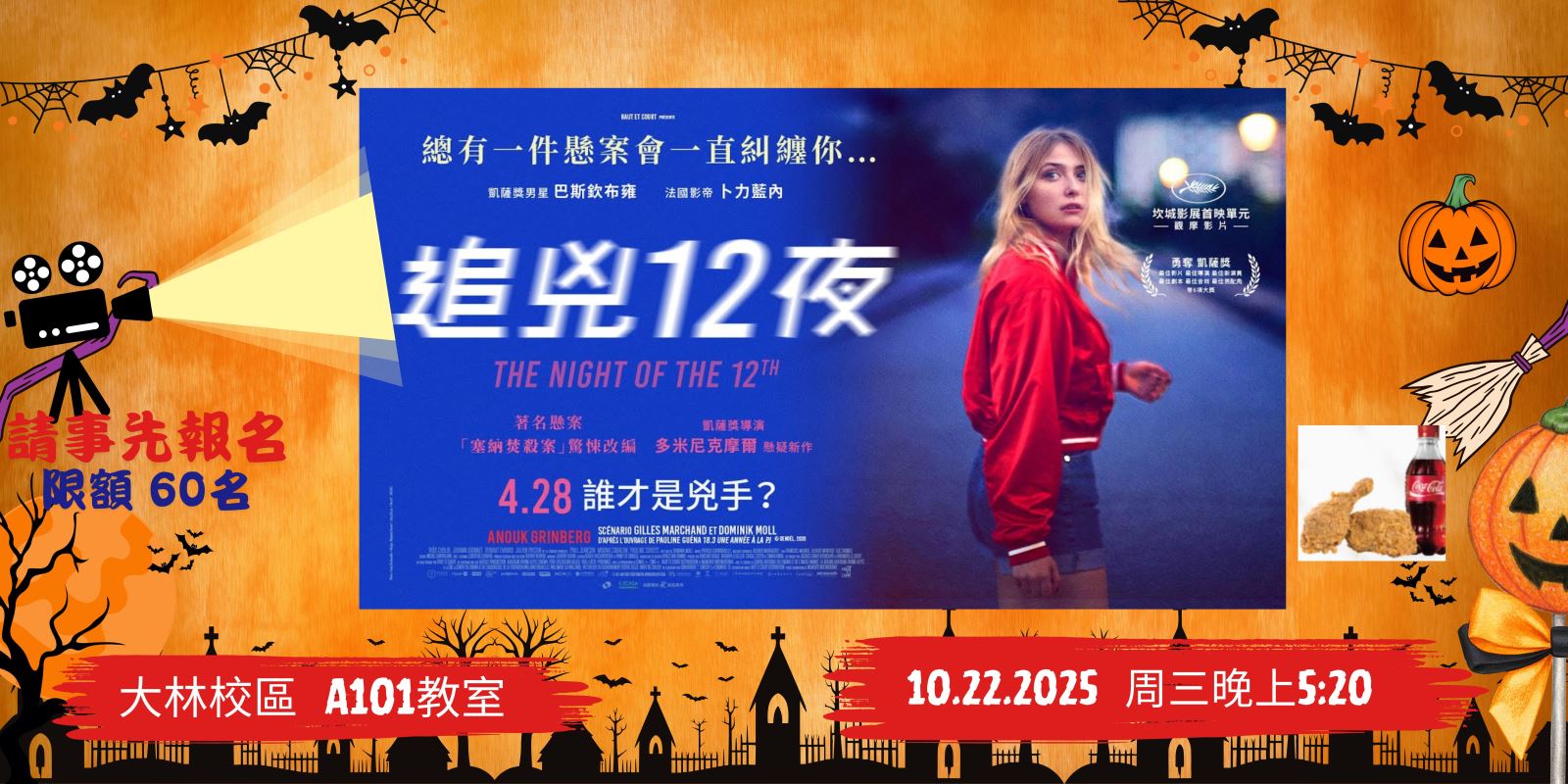 [大林校區 10月電影欣賞活動 ] 日期/時間:10.22三 17:20-20:00 提供晚餐,請事先報名 限額60名**額滿為止** _________________________________ 地點:大林校區A101教室(限60名) 主辦:圖書館 協辦:學輔中心 播放影片:《追兇12夜》 導演:多米尼克摩爾 演員:巴斯蒂安布永、卜力藍內、寶琳塞里、盧拉科託內弗拉皮爾 簡介:「每個警探的職業生涯,都會出現一個永生難忘的懸案」的電影《追兇12夜》,10月12號的那晚,女孩克拉拉在離開派對後獨自回家,卻在路上遭到不明縱火焚身,活活被燒死,出動警探約翰(巴斯欽布雍 Bastien Bouillon 飾)一路追查。驚人的是,該調查案雖從克拉拉的生活圈展開,錯綜複雜的謎團也逐漸浮出水面,但每個嫌疑犯卻一一咬定與克拉拉的風流韻事,讓約翰發現他要面對的,恐怕不只是犯案真兇…。 報名網址:https://forms.gle/HryBVD9E6pkkgY4w5