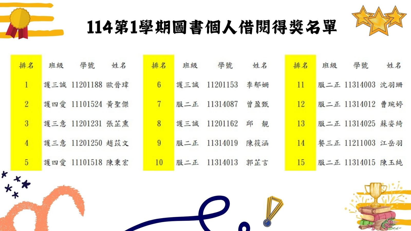 114-1 學期個人圖書館借閱獎勵競賽得獎名單公告