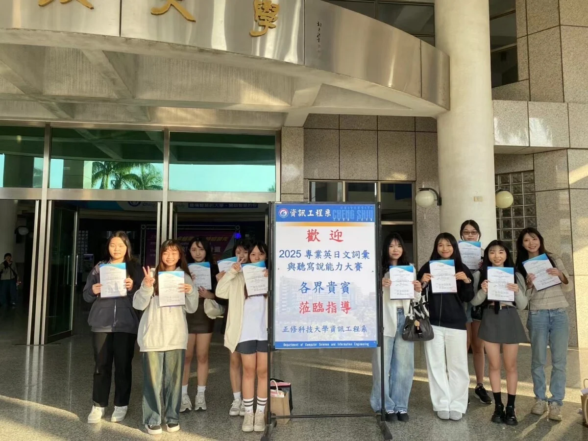 圖:崇仁醫護管理專科學校美容保健科學生參加「華人資訊語文競技與創意設計大賞─2025」專業英(日)文(ESP)詞彙與聽寫說能力大賽南區賽事,表現優異、獲獎連連,賽後於正修科技大學校園合影留念,手持獎狀展現自信與學習成果。